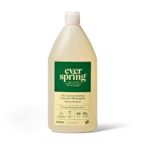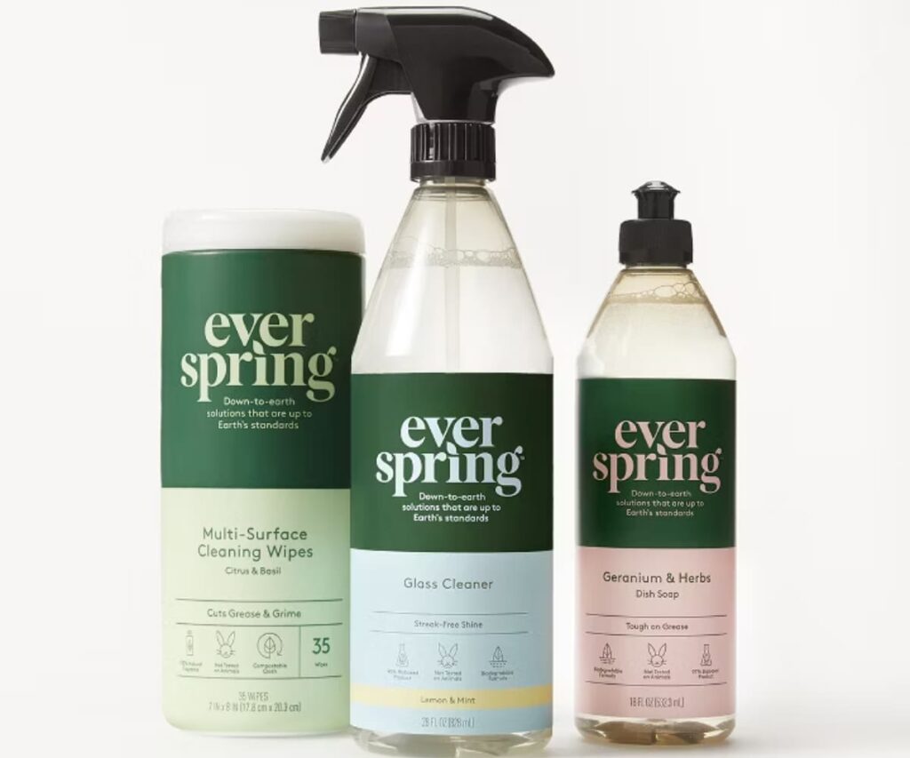 Everspring products are made with plant-derived ingredients and use recyclable packaging, including post-consumer plastic. The brand focuses on sustainability by offering concentrated formulas and refillable options to reduce waste.